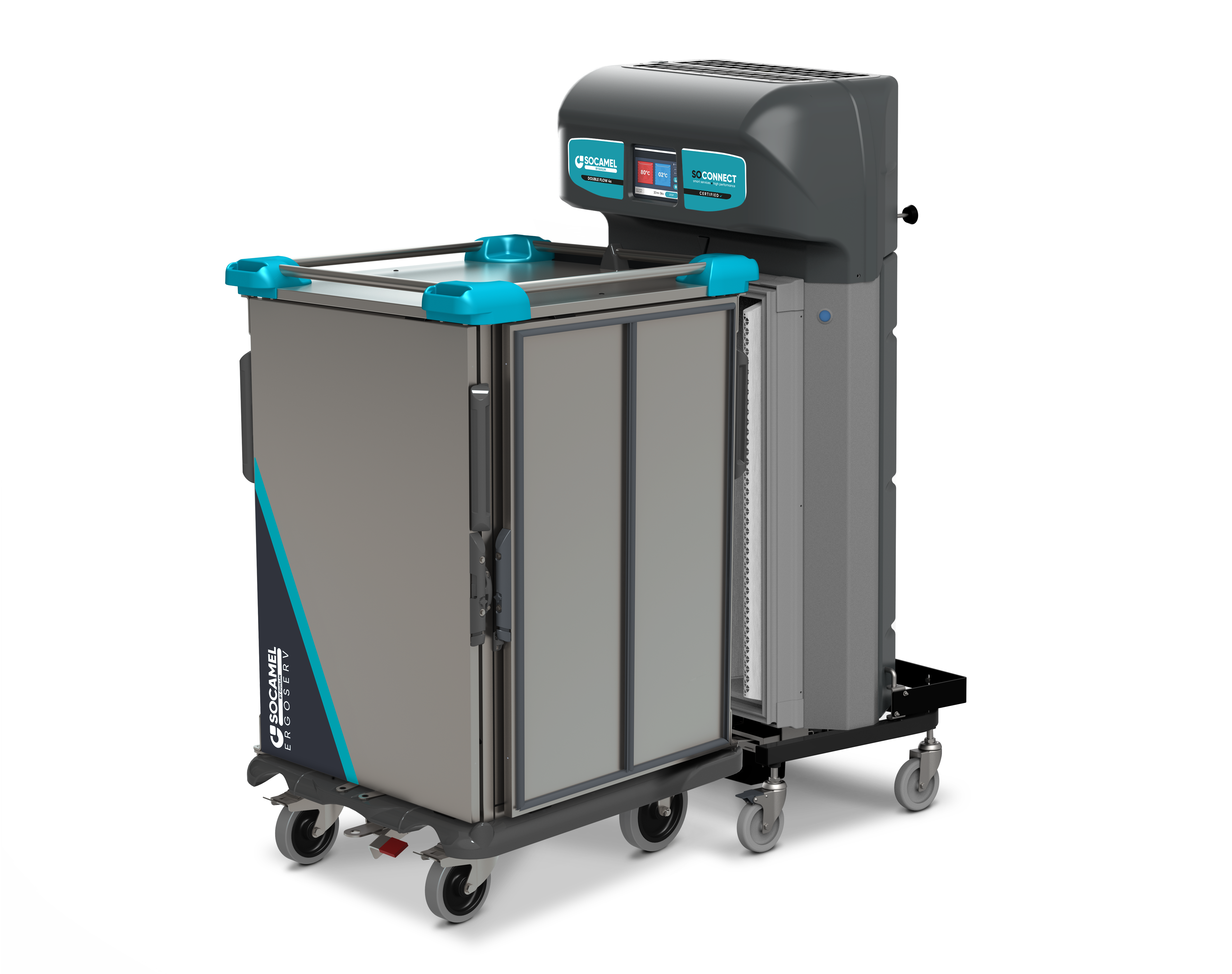 DOUBLEFLOW ERGOSERV je systém dokovací stanice a vozíku typu shuttle, který zajišťuje propojení mezi kuchyní a jednotlivými odděleními. Perfektní řešení pro distribuci teplých i studených pokrmů.