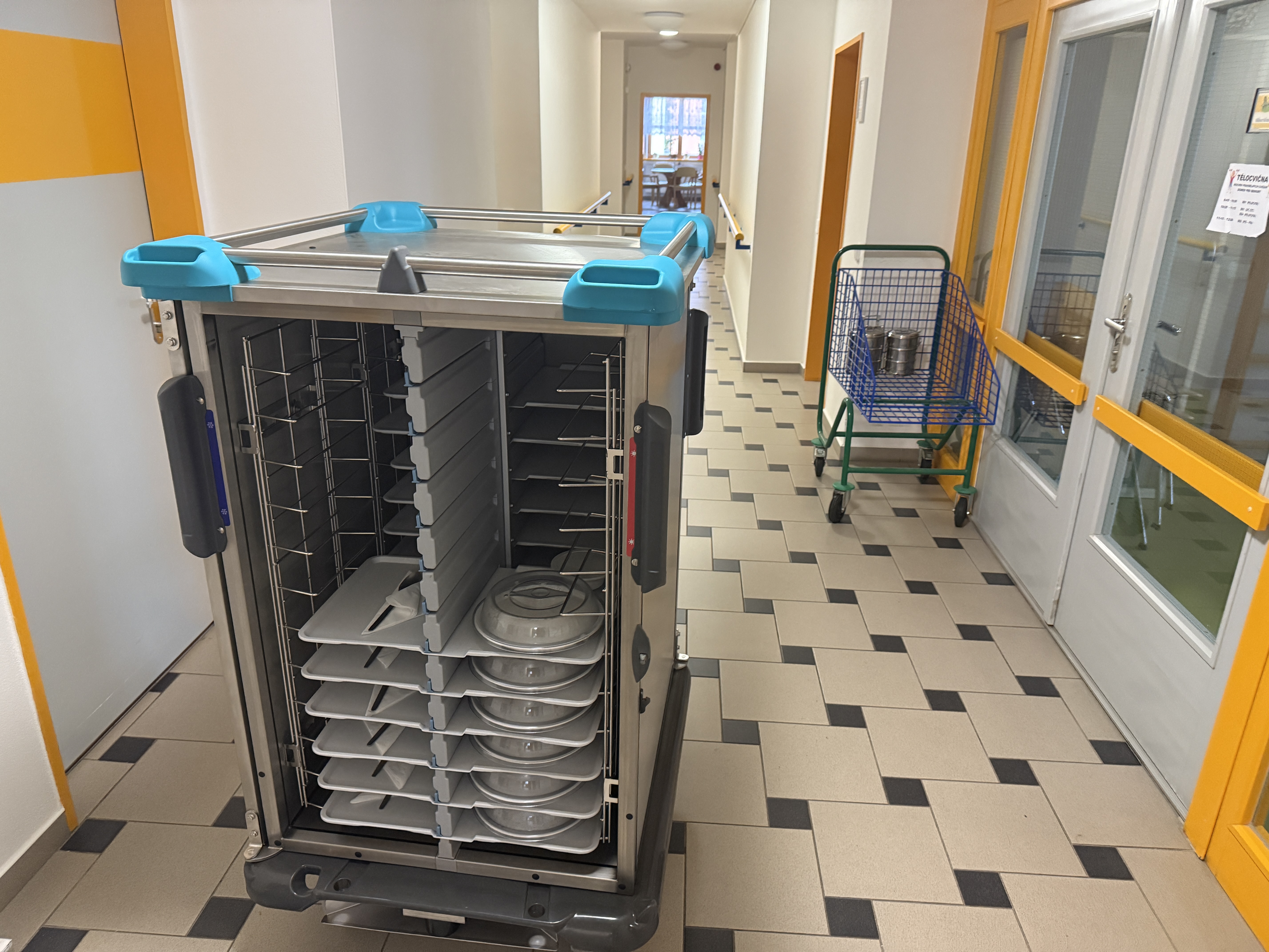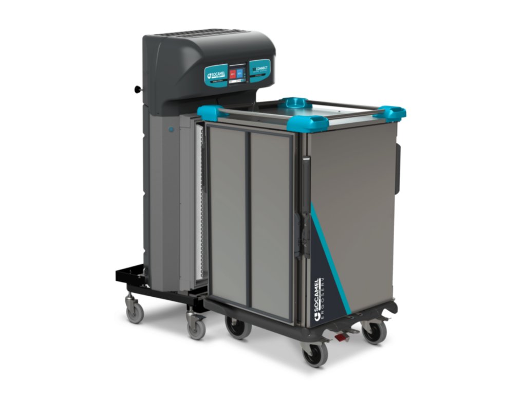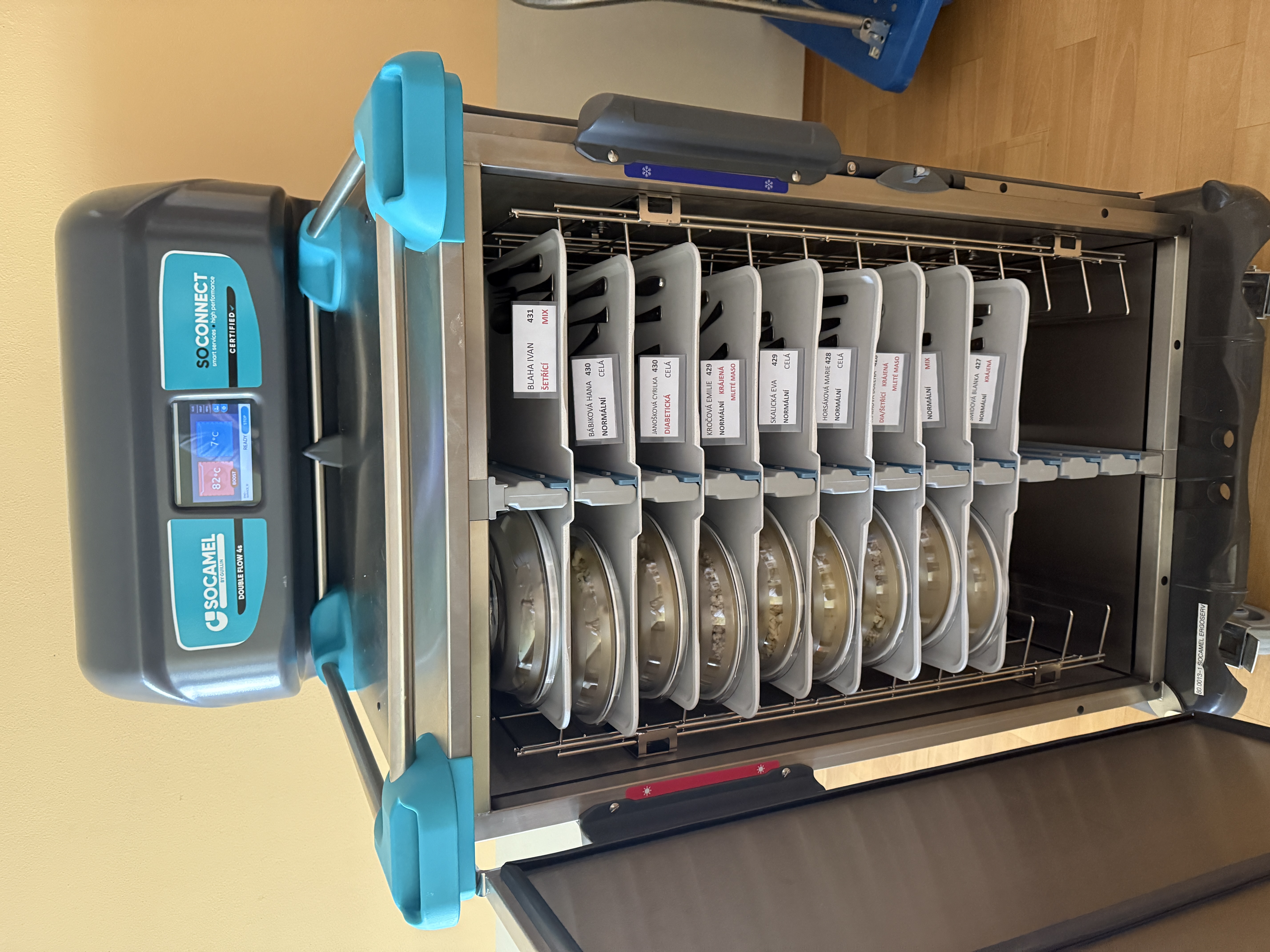 Dokovací stanice zůstává v kuchyni, což zajišťuje nízkou hmotnost vozíku a snadnou manipulaci při distribuci na odděleních.